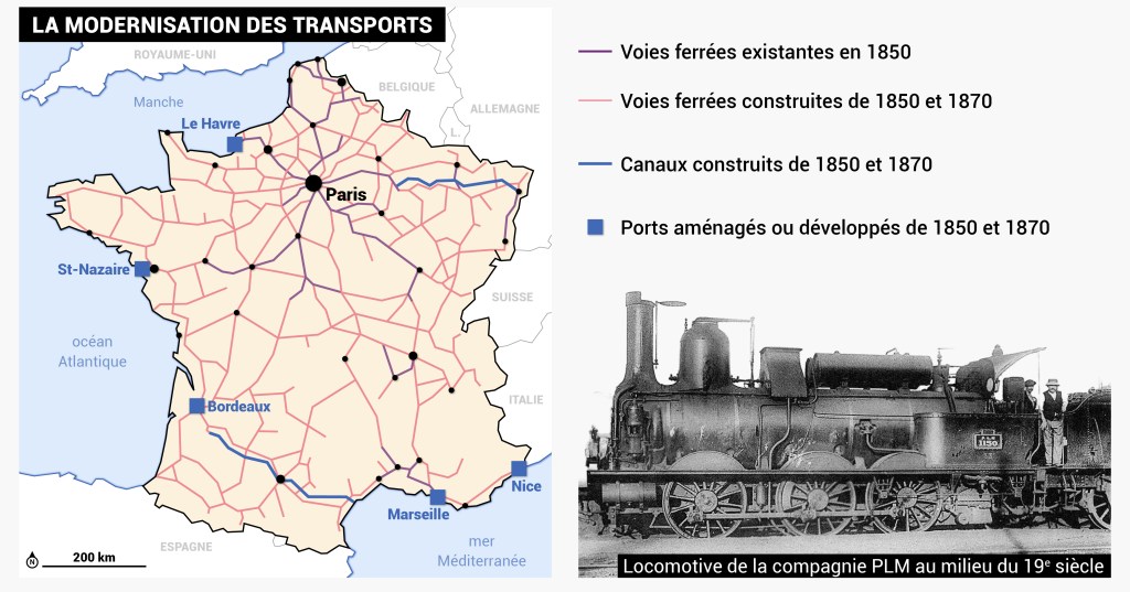 - Années 1850. Développement du réseau ferroviaire et des canaux