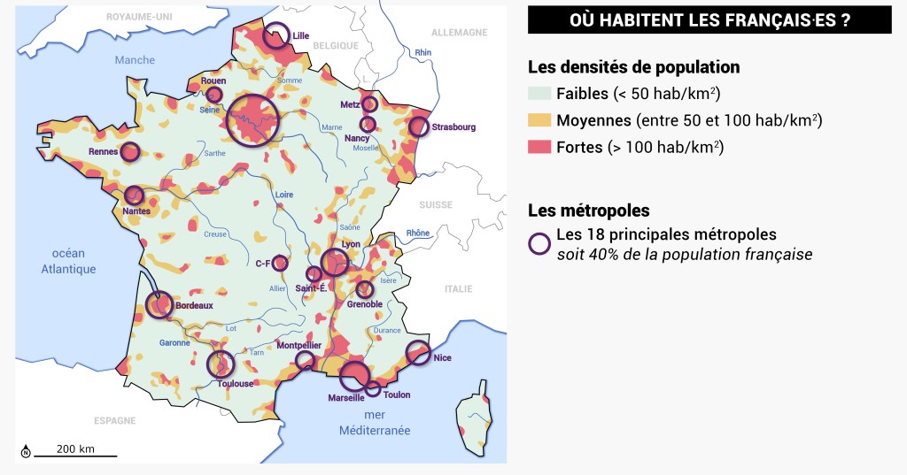 2. Montre que la répartition de la population n’est pas homogène en France.