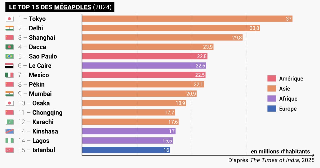 - Mégapole. Ville très peuplée, d’au moins de 10 millions d’habitants