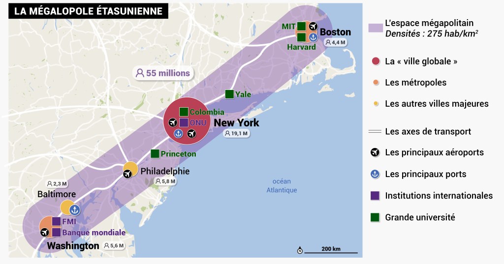 - Mégalopole. Vaste espace urbain qui regroupe plusieurs métropoles