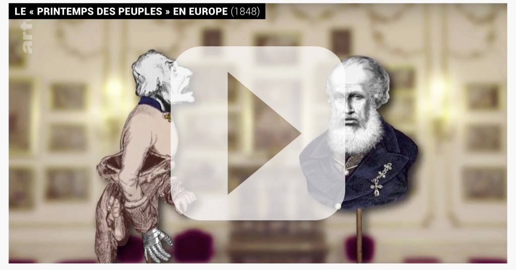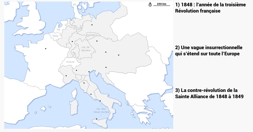 « En France, le peuple se révolte les 23, 24 et 25 février 1848 et la Seconde République est instaurée. En mars, des émeutes inspirées de celle de Paris éclatent aussi à Vienne, à Berlin et à Prague, puis se diffusent. Celles-ci viennent principalement des villes et émanent surtout de la bourgeoisie intellectuelle, des artisans et des ouvriers. Dans les pays touchés, les moyens de lutte sont similaires : barricades, journaux et affiches pour s’opposer à l’absolutisme des monarques. De Paris à Turin, de Milan à Zagreb ou de Budapest à Palerme, on retrouve les mêmes images de combattants sur des barricades construites avec des matériaux identiques, brandissant drapeaux et fusils. Dans un premier temps, les gouvernements cèdent et certains sont renversés. En Autriche, Metternich démissionne le 13 mars et fuit, caché dans une corbeille à linge. Le lendemain, l’empereur Ferdinand Ier promet une constitution à l’Empire. En Prusse, le 18 mars, le roi accepte lui aussi une constitution après les émeutes de Berlin. Les chefs de ces mouvements insurrectionnels se connaissaient souvent déjà : beaucoup ont été exilés à Paris, Bruxelles ou Londres. Par exemple, le polonais Louis Mieroslawki (actif en Pologne, en Italie, à Berlin, à Paris ou en Sicile) participe à plusieurs révolutions entre 1846 et 1850. Toutes ces révoltes européennes expriment des revendications libérales et nationales : suffrage universel, constitution, autodétermination. En Italie, ce sont surtout des avocats patriotes et des propriétaires libéraux qui rejettent la domination autrichienne. En Allemagne, on réclame l’unité et la fin de la domination danoise au Nord. En Autriche, le gouvernement veut unir les pays de langue allemande. À Prague, on souhaite obtenir plus de libertés politiques ainsi que l’égalité avec les autres peuples de l’Empire. À Budapest, on veut à la fois la suppression des droits féodaux et plus d’autonomie. Ces luttes s’appuient sur une identité commune, construite autour d’une langue, d’une histoire politique et d’une culture. Dès juin 1848 cependant, une vague de répression contre-révolutionnaire s’abat sur l’Europe : l’armée autrichienne reprend Prague et l’armée prussienne met fin au Parlement de Francfort où une assemblée avait été élue pour unifier l’Allemagne. En juillet 1848 puis en mars 1849, l’armée autrichienne met elle aussi fin aux espoirs d’unification en assiégeant Venise… Les puissants royaumes du Piémont-Sardaigne et de Prusse ont toutefois une constitution et semblent désormais capables de mener l’unification de l’Italie et de l’Allemagne. »