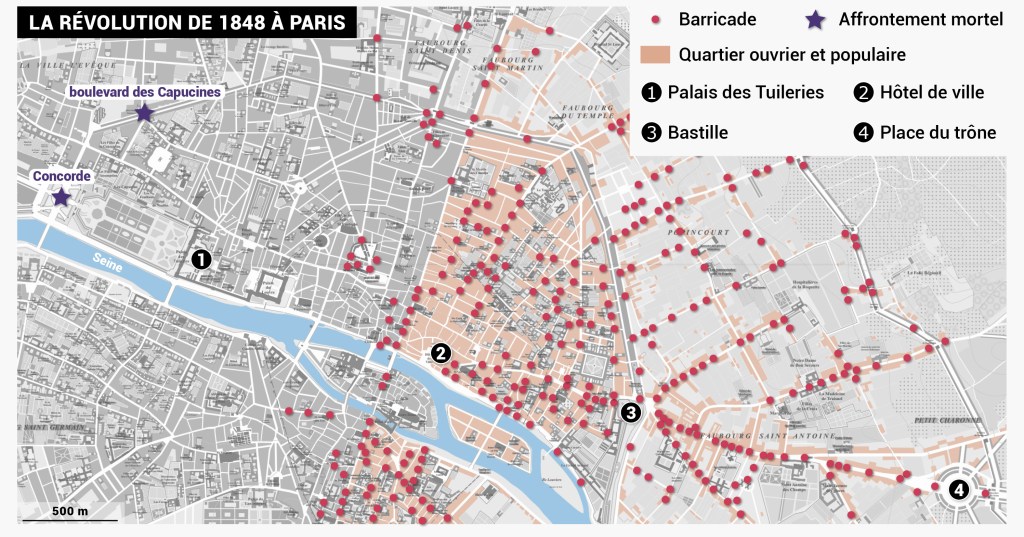- 24 février. Les insurgés se dirigent vers les Tuileries : le roi abdique