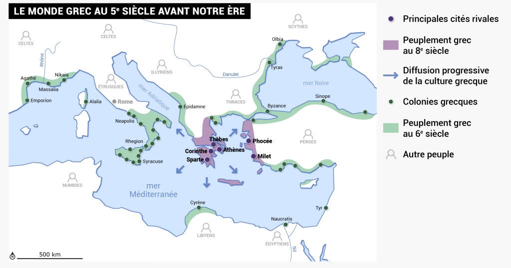 5. Montre que la culture grecque se diffuse autour de la Méditerranée à partir du 8e siècle avant notre ère.