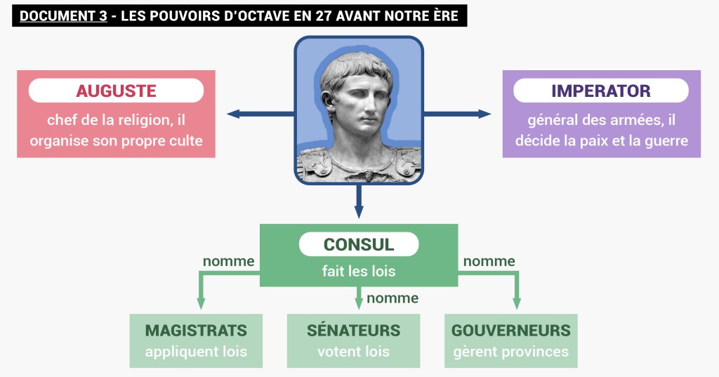 27 av. JC. En -27, Octave joue la carte de l’humilité : il rend ses pouvoirs au Sénat… qui le couvre d’honneurs et lui donne le titre d’Auguste. Il fonde alors le principat, un nouveau régime appelé Empire, et prend le titre de princeps (« premier citoyen »). Il conserve ainsi les institutions de la République qu’il prétend restaurer, mais s’appuie en réalité sur sa puissance pour concentrer les pouvoirs et gouverner seul ! document 3