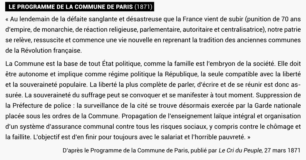 - Commune de Paris. Gouvernement insurrectionnel et populaire qui dirige de manière autonome Paris de mars à mai 1871