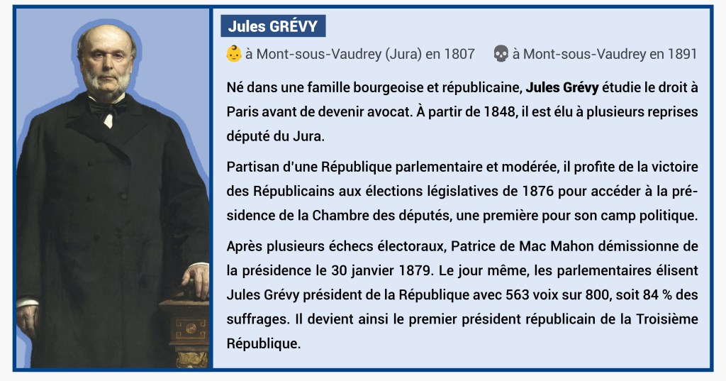 - 1879. Victoire des républicains aux élections sénatoriales : Mac Mahon démissionne et Jules Grévy lui succède