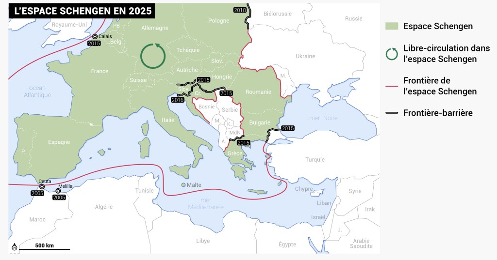 - Espace Schengen. Espace de libre circulation des personnes depuis 1995 en Europe