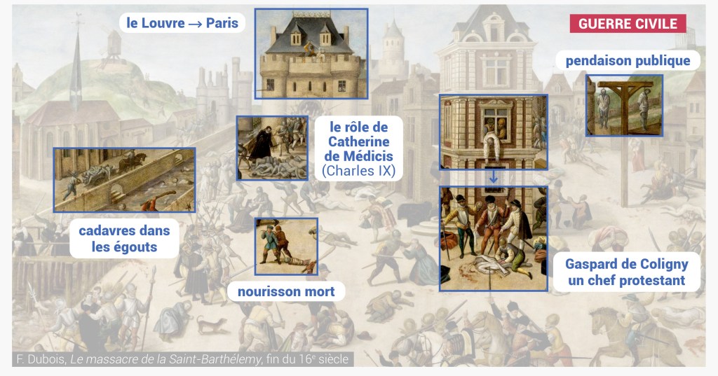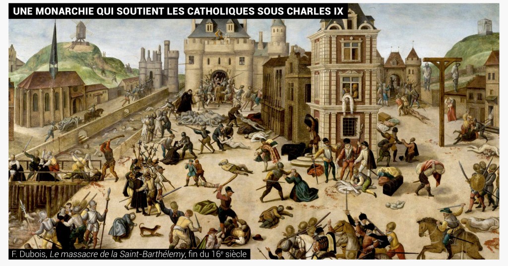 - 1572. Massacre de la Saint-Barthélemy : le roi Charles IX ordonne l’assassinat des chefs protestants réunis à Paris