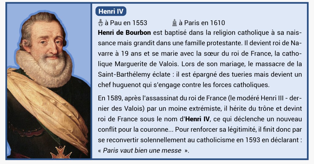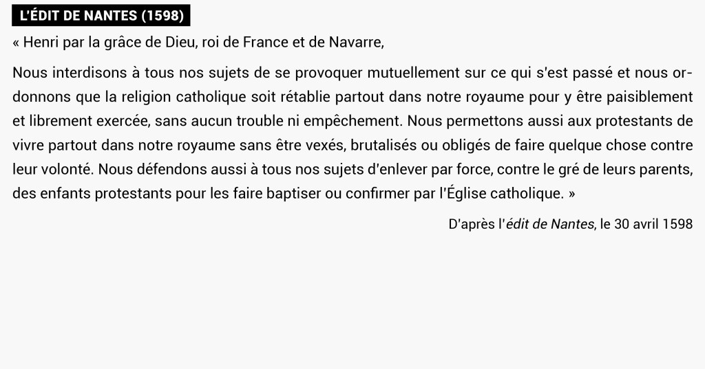 - 1598. Édit de Nantes : Henri IV met fin aux guerres de religion en établissant une certaine tolérance religieuse