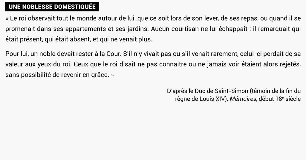 2. Relève des éléments montrant que Louis XIV utilise la vie à Versailles pour « domestiquer la noblesse ».