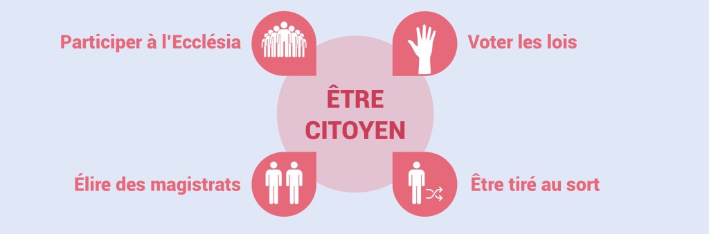 • Une démocratie toutefois incomplète. Mais ne crions pas victoire trop vite : cette démocratie a un sacré trou dans la raquette : sur l’ensemble des habitants d’Athènes, seulement 10 % sont citoyens. Pour avoir ce statut tant convoité, il faut être un homme, libre, né de parents athéniens. Dit autrement : les femmes, les métèques (étrangers installés à Athènes) et les esclaves sont automatiquement exclus du jeu politique. Dommage pour elles et eux. Il s’agit donc d’une citoyenneté forte puisqu’elle offre beaucoup de pouvoir aux citoyens égaux en droits, mais d’une citoyenneté fermée puisque réservée à une minorité !