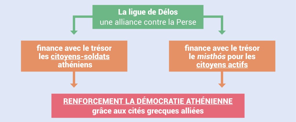 • La ligue de Délos. Profitant ainsi de son prestige, Athènes prend la tête d’une alliance avec les cités de la mer Égée pour lutter contre les Perses (-478). Cette alliance est appelée « Ligue de Délos », du nom de l’île sur laquelle est stocké le trésor destiné à financer une flotte de guerre commune. Mais quand la menace perse s’éloigne, Athènes oublie de dissoudre le club et continue de réclamer sa cotisation (le phóros). Les cités qui veulent partir ? Matées sans ménagement ! Petit à petit, la ligue devient moins une alliance qu’un empire athénien déguisé…