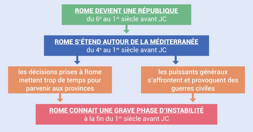 • Une République instable. Mais à force de grandir, la République romaine commence à vaciller et les décisions prises à Rome mettent trop de temps à parvenir aux provinces. Au 1er avant notre ère, entre les ambitions démesurées des généraux, le mécontentement populaire et la succession de guerres civiles, le système vacille… L’armée se transforme en instrument de pouvoir personnel, les rivalités s’intensifient et les institutions cèdent sous la pression. Nommé « dictateur à vie », la tentative de Jules César de prendre le pouvoir en 45 avant notre ère n’arrange rien à la situation… Ainsi, après cinq siècles d’existence, la République connait une grave phase d’instabilité !