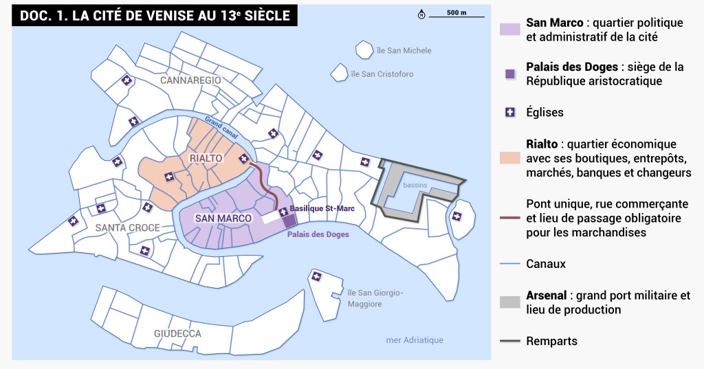 À l’aide des documents, complète le tableau afin de montrer que Venise est une puissance politique, commerciale et militaire qui domine la Méditerranée.