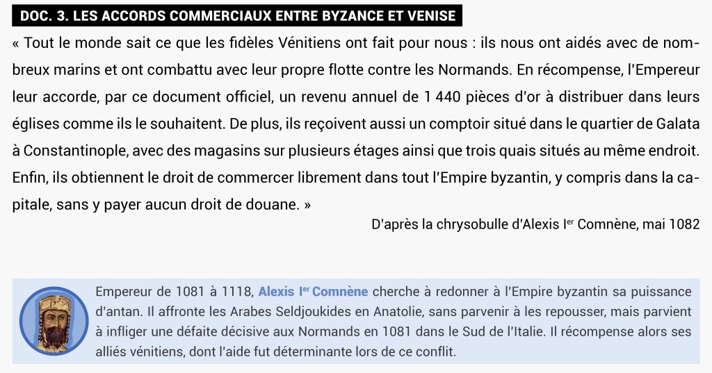 - 1082. Byzance accorde des avantages commerciaux aux Vénitiens
